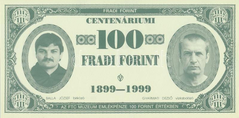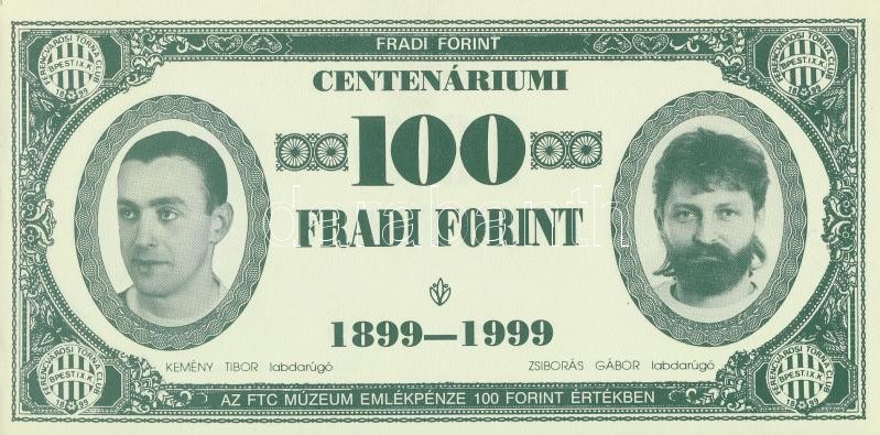 Leírás: 1999. 100Ft névértékű " Centenáriumi Fradi Forint" Kemény, Zsiborás, Balla, Gyarmati fényképével T:I