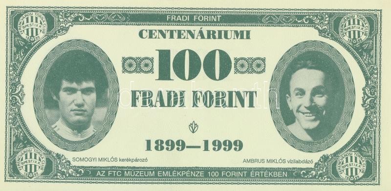 Leírás: 1999. 100Ft névértékű " Centenáriumi Fradi Forint" Somogyi, Ambrus, Dr. Páncsics, Rákosi fényképével T:I