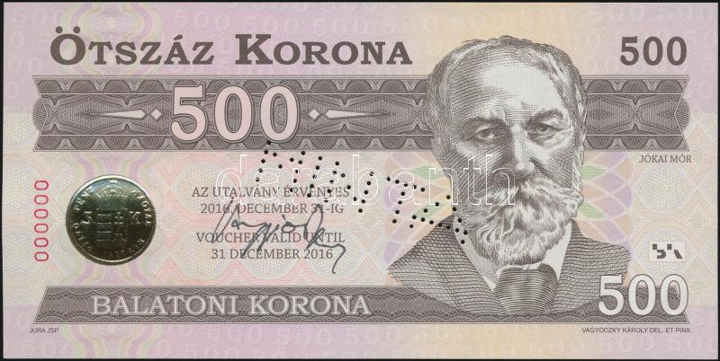 Leírás: 2012. 10.000K "Balatoni Korona" "000000" sorszámmal, "MINTA" perforációval, a tervező, Vagyóczky Károly aláírásával T:I