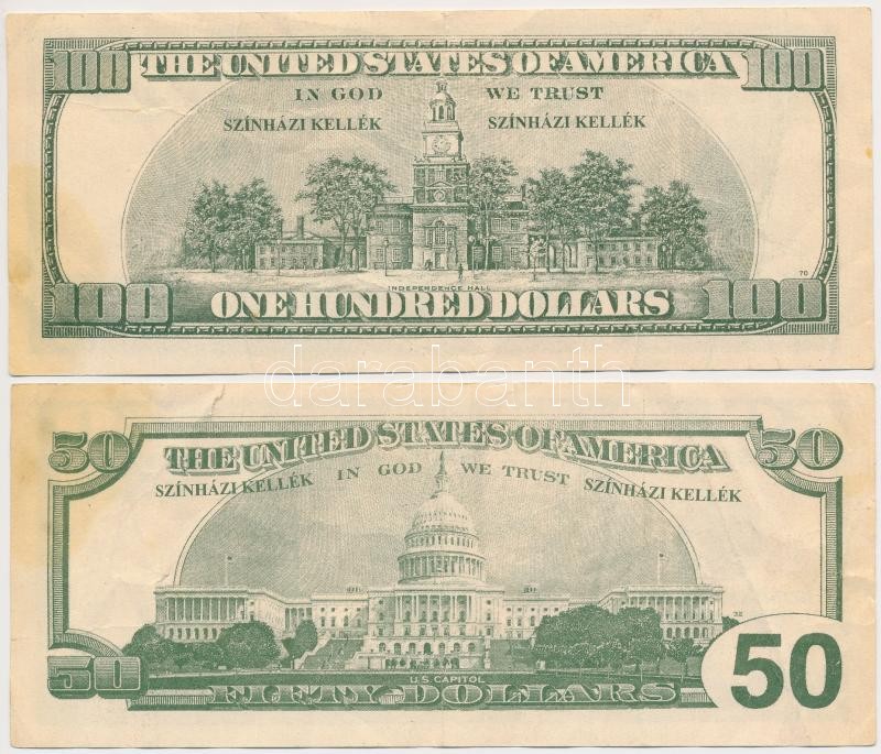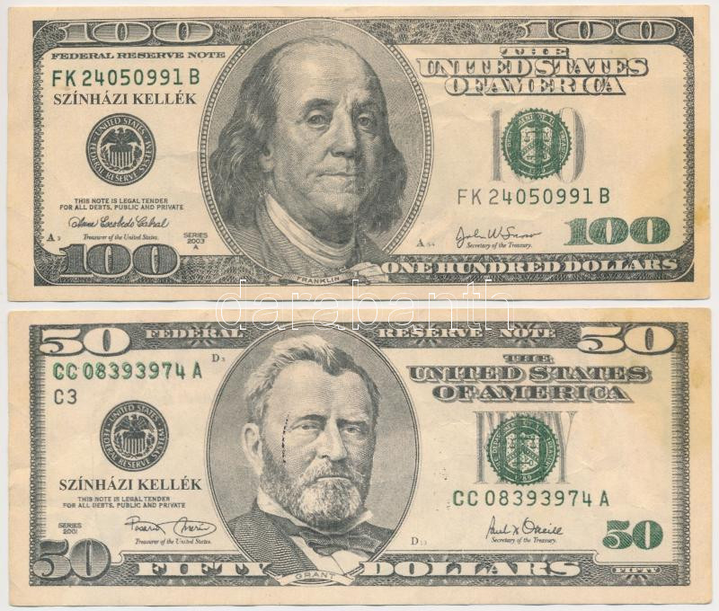 Leírás: 2db színházi kellék pénz: Amerikai Egyesült Államok 2001. 50$ + 2003. 100$ T:III