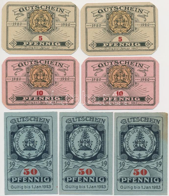 Germany / Weimar Republic / Dannenberg 1920. 5 Pfennig (2x) sequential serials + 10 Pfennig (2x) sequential serials + 50 Pfennig (3x) sequential serials C:AU
