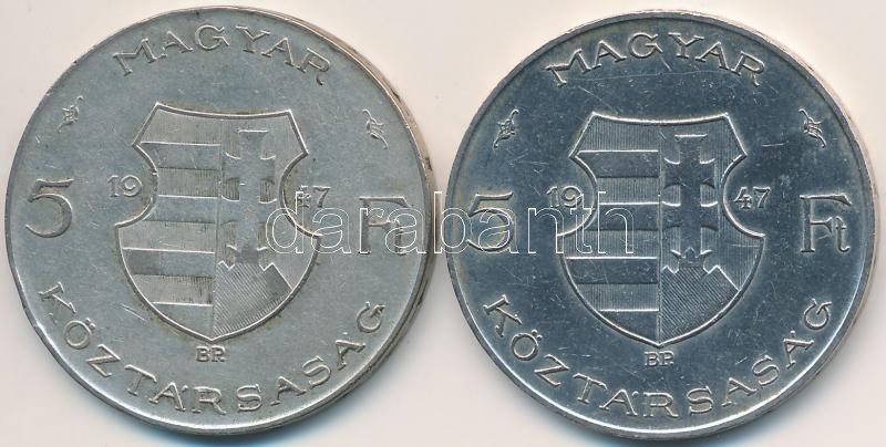 1947. 5Ft Ag "Kossuth" (2x) T:2-,3 https://www.darabanth.com/hu/261-Gyorsarveres/261.0/Numizmatika/Magyar-es-magyar-verdejelu-fem-es-ezustpenzek~300008/1947-5Ft-Ag-Kossuth-2x-T2-3~II1290870