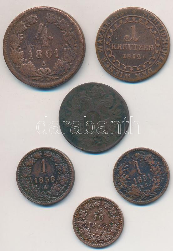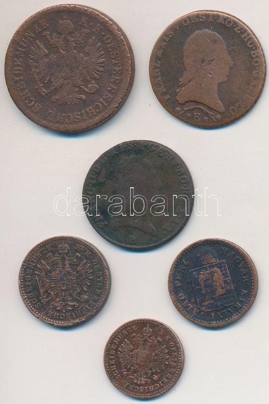 Leírás: Vegyes: 1800-1891. 6db klf magyar és osztrák Cu krajcár, közte 1858B 5/10kr Cu T:2-,3