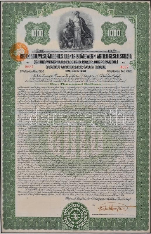 USA / New York 1927. "Rhine-Westphalia Electric Power Corporation (Rheinisch-Westphälisches Elektrizitätswerk Aktien-Gesellschaft)" direct mortgage gold bond about 1000 Dollars in frame C:F