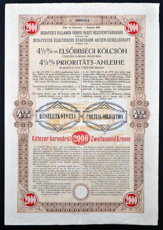 Leírás: Budapest 1908. "Budapesti Villamos Városi Vasút Részvénytársaság" 4 1/2%-os elsőbbségi kölcsöne 2000K-ról szelvényekkel T:III