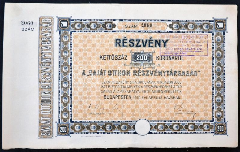Leírás: Budapest 1910. "Saját Otthon Részvénytársaság" részvénye 200K-ról szelvényekkel, felülbélyegzéssel T:III