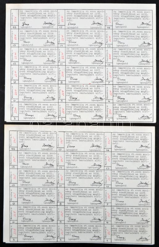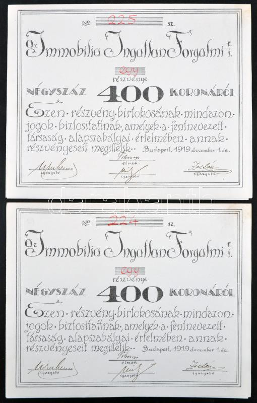 Leírás: Budapest 1919. "Az Immobilia Ingatlan Forgalmi Részvénytársaság" 5 részvénye 400K-ról szelvényekkel (2x) sorszámkövetők T:I-