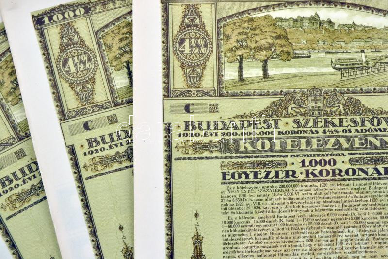 Budapest 1920. "Budapest Székesfőváros" kötelezvények 1000K-ról (3x) sorszámkövetők, mindhárom magyar és német nyelven szelvényekkel, szárazpecséttel T:I-