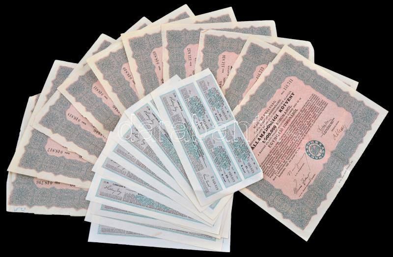 Leírás: Budapest 1925. "Magyar Királyság 5%-kal kamatozó Járadékkölcsön Államadóssági Kötvény" 1.000.000K-ról (10x) szelvényekkel, közte több sorszámkövető T:vegyes