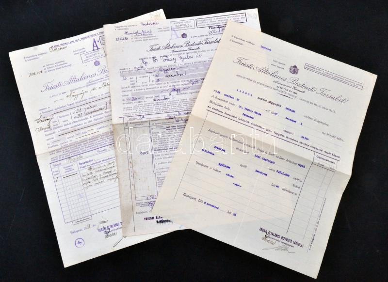 Leírás: Budapest 1938-1944. "Triesti Általános Biztosító Társulat" 3db különféle biztosítási kötvénye T:III
