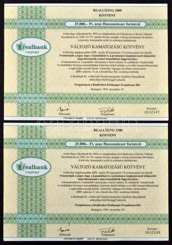 Leírás: Budapest 1994. "Reallízing" változó kamatozású kötvény 25.000Ft-ról (2x) T:II