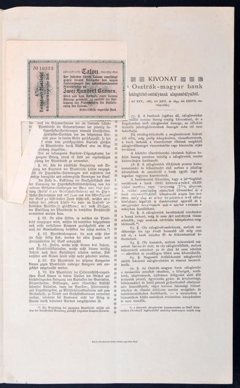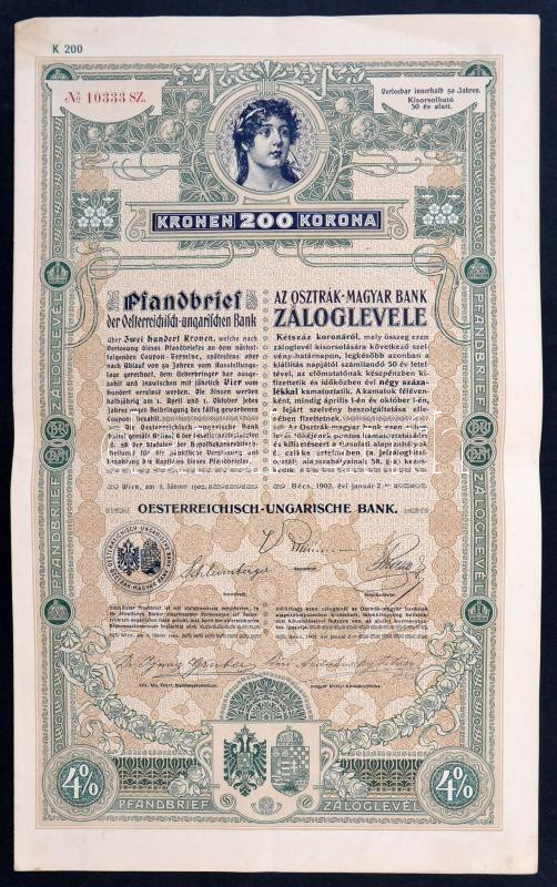 Leírás: Osztrák-Magyar Monarchia / Bécs 1902. "Osztrák-Magyar Bank" záloglevele 200K-ról, 1db szelvénnyel T:II-
