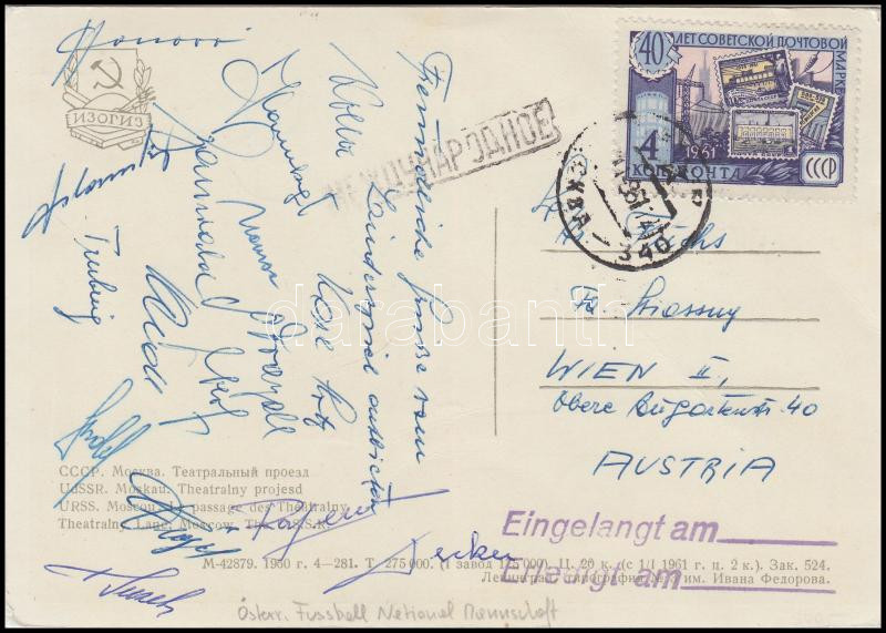 1961 Az osztrák válogatott labdarúgócsapat tagjainak saját kezű aláírásával elküldött képeslap a Szovjet csapat ellen győzelemmel végződött meccsről. / 1961 Austrian national football team members signature on postcard send from the match against the Soviet team. (Decker, Flögel, Knorr, Stolz, Fraydl, Koller)