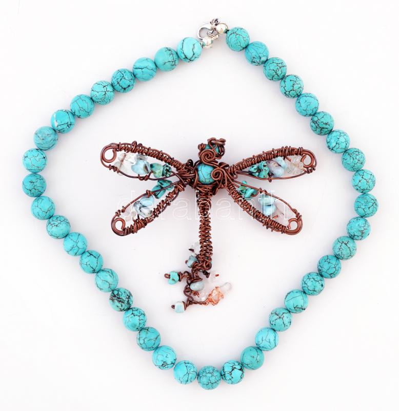 Leírás: Dekoratív türkiz gyöngysor türkizzel és hegyikristállyal díszített réz szitakötő alakú függővel, h: 40 cm