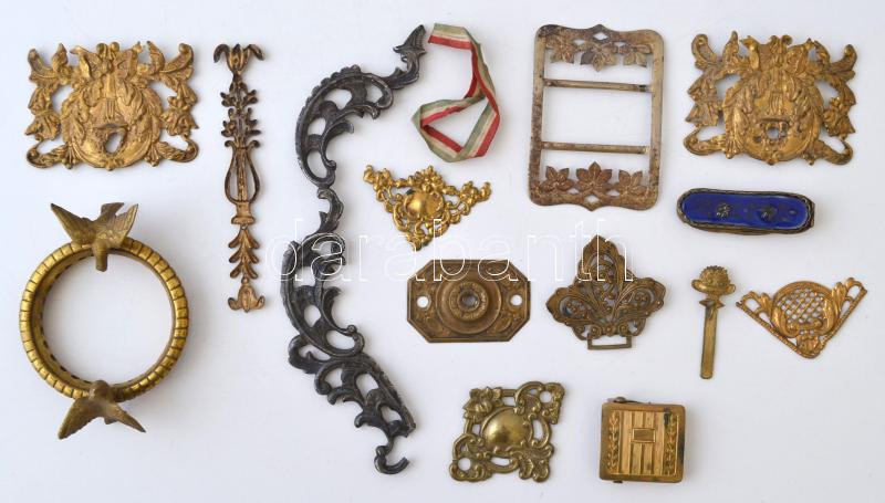 Leírás: Különféle réztárgyak, köztük sok Biedermeier bútorverettel, összesen 14 db