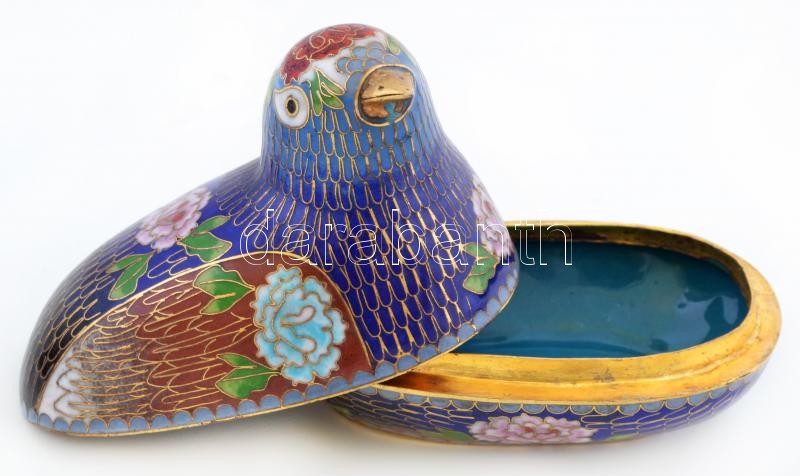Leírás: Madaras bonbonier, réz, zománc díszítéssel, fa tartóval, m:10 cm
