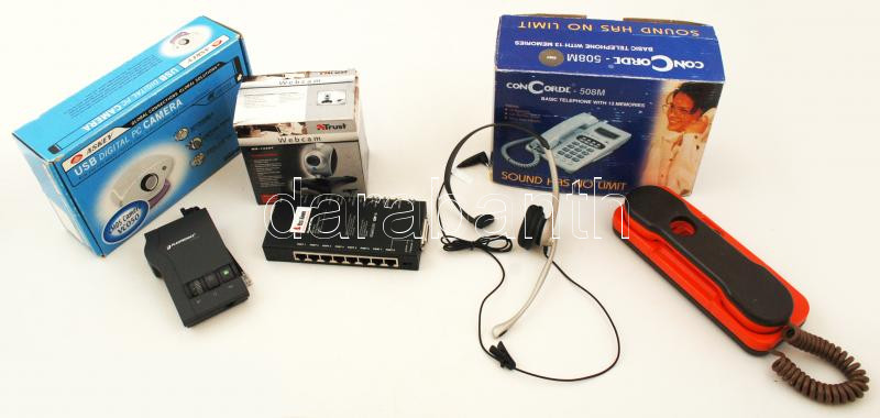 Vegyes műszaki tétel: TRUST WB-1400T webkamera, saját dobozában, illesztőprogrammal, leírással, működik; retró kaputelefon, Red Hawk 10Base-T BL-509 MicroHub, saját dobozában, CMOS-A USB webkamera, saját dobozában, leírással, Plantronics headset, Concord C-508M telefon, saját dobozában