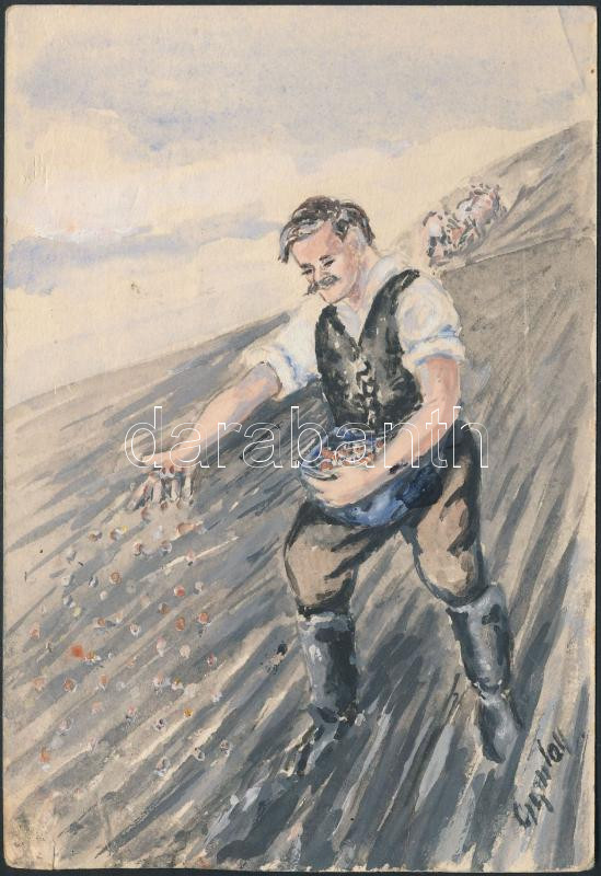 Gyulay jelzéssel: Vetés. Akvarell, papír, jelzett, 15x10 cm https://www.darabanth.com/hu/262-Gyorsarveres/262.0/Festmeny-mutargy-papirregiseg-egyeb/Festmenyek-es-grafikak~400051/Gyulay-jelzessel-Vetes-Akvarell-papir-jelzett-15x10-cm~II1299991