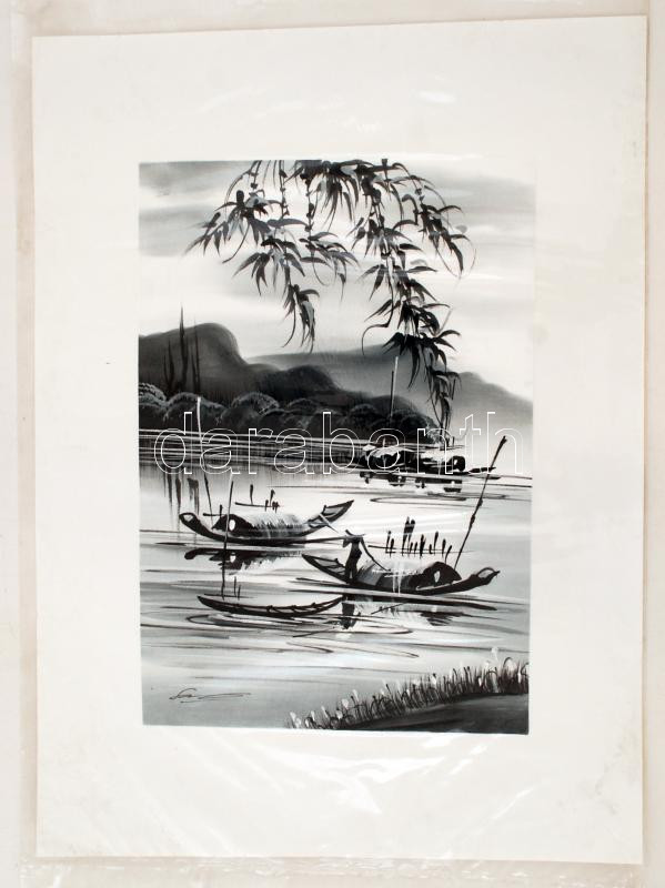 Leírás: Olvashatatlan jelzéssel: Hajók a lagúnában, távol-keleti életkép, vegyes technika, vászon, 30,5×22 cm