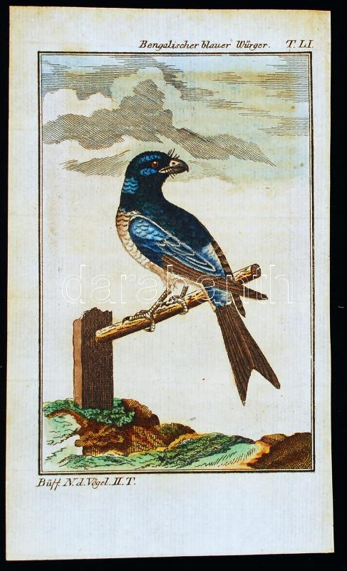 1784-1785 Bengáli kék gébics, George-Louis Leclerq de Buffon (1707-1788) francia természettudós Allgemeine Naturgeschichte című művéből (Berlin, 1771). Rézmetszet, papír, 12,5×8 cm