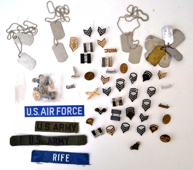 Leírás: Nagy amerikai militáriatétel, benne dögcédulák, alakulatjelvények, stb, kb 30 db.