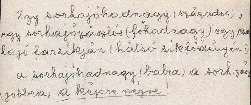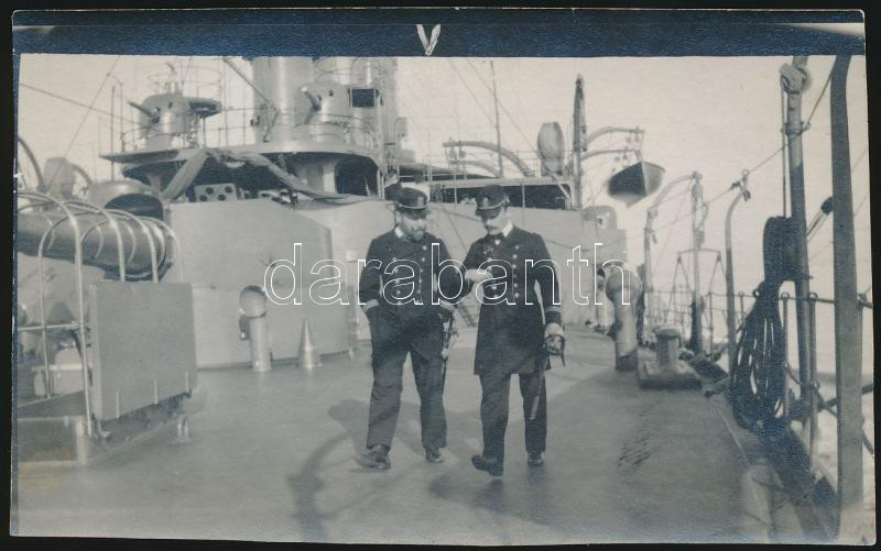 cca 1910 Egy sorhajóhadnagy (százados) és egy sorhajózászlós (főhadnagy) eszmecseréje egy csatahajó farsíkján, hátsó síkfödényén. Korabeli fotó, hátulján feliratozva.11x7 cm.
