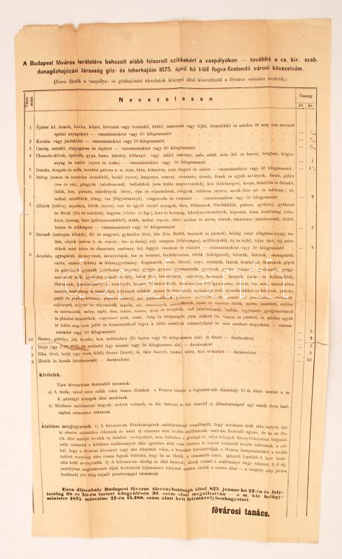 Leírás: 1875 Hirdetmény városi kövezetvámról, Fővárosi Tanács, szakadással, 49x30cm