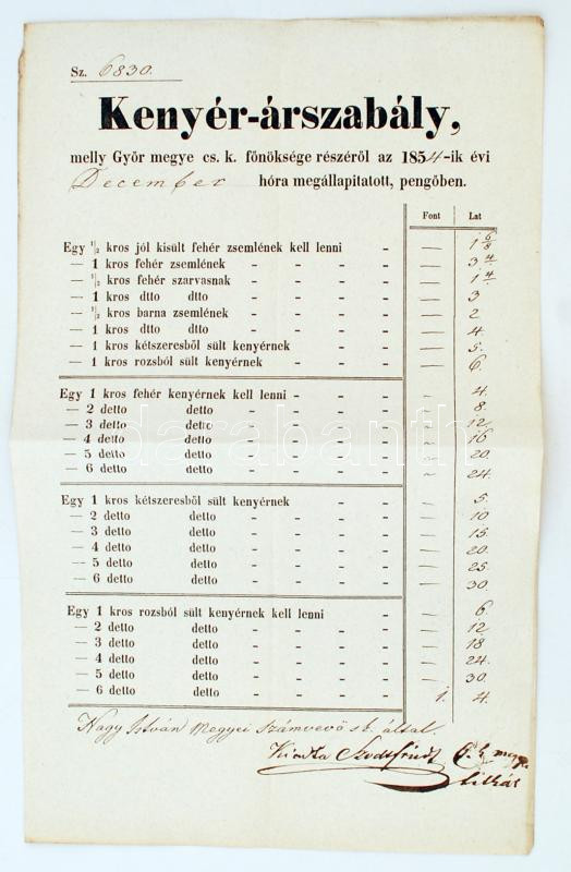 1854 Győr megye cs. k. főnöksége által megállapított kenyér árszabály https://www.darabanth.com/hu/262-Gyorsarveres/262.0/Festmeny-mutargy-papirregiseg-egyeb/Okmanyok~36/1854-Gyor-megye-cs-k-fonoksege-altal-megallapitott-kenyer-arszabaly~II1305062