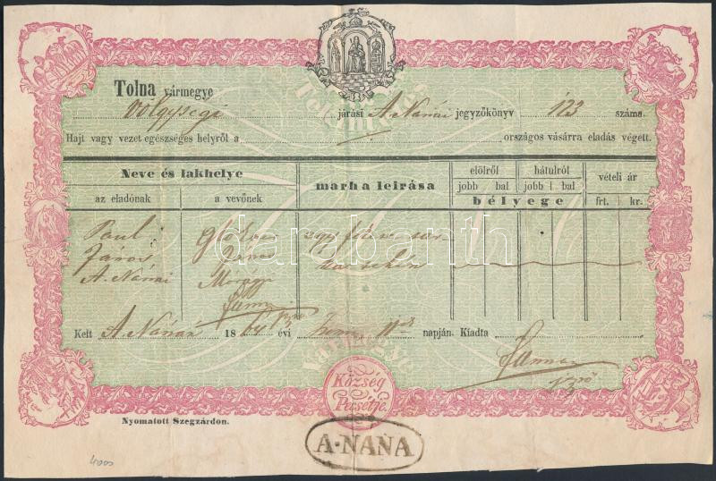 1864 Marhalevél Alsónána községből, "A.Nána" oválbélyegzővel... https://www.darabanth.com/hu/262-Gyorsarveres/262.0/Festmeny-mutargy-papirregiseg-egyeb/Okmanyok~36/1864-Marhalevel-Alsonana-kozsegbol-ANana-ovalbelyegzovel~II1302224