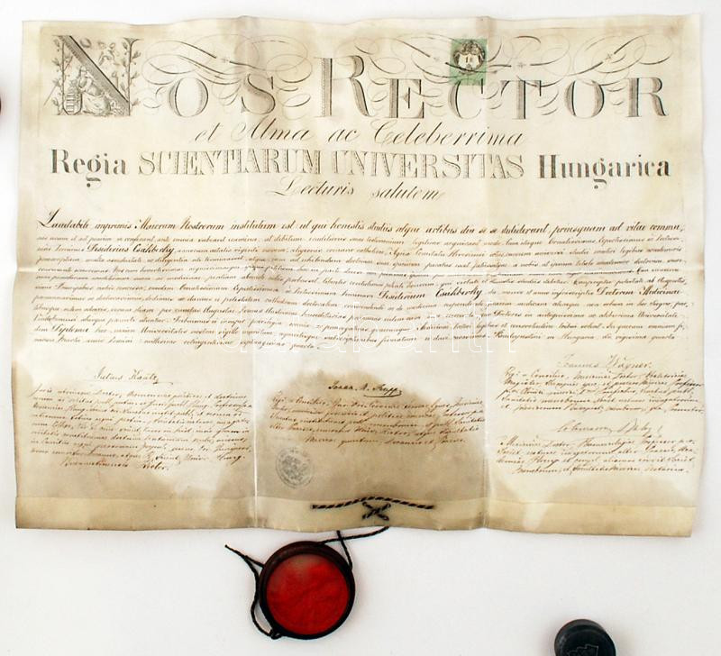 Leírás: 1874 Orvosi pergamen diploma,elmosodott viasz függőpecséttel, pecséttartó fedél nélkül egyébként jó állapotban, 44x60cm / Doctor's diploma