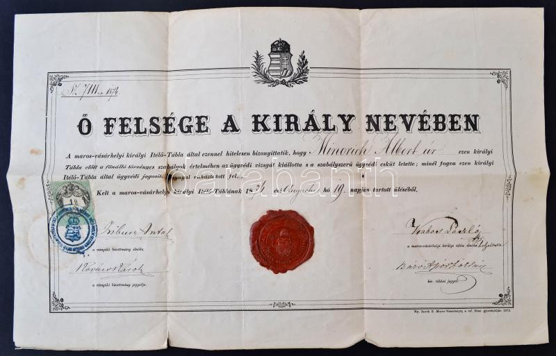 Leírás: 1874 Ügyvédi oklevél, tanúsítvány az ügyvédi eskü letételéről. Jó állapotú viaszpecséttel, okmánybélyeggel. 46x30 cm.