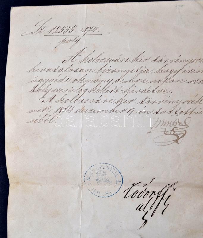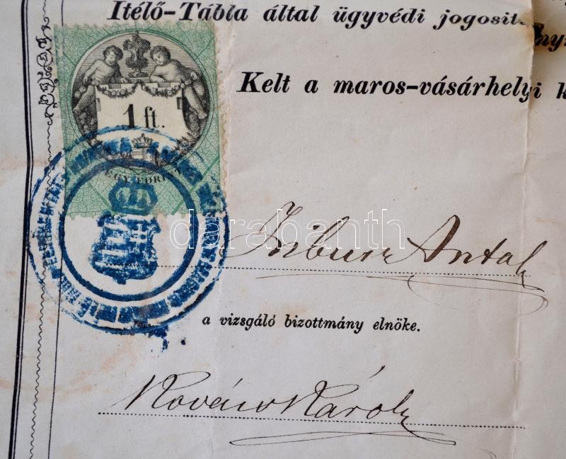 1874 Ügyvédi oklevél, tanúsítvány az ügyvédi eskü letételéről. Jó álla... https://www.darabanth.com/hu/262-Gyorsarveres/262.0/Festmeny-mutargy-papirregiseg-egyeb/Okmanyok~36/1874-Ugyvedi-oklevel-tanusitvany-az-ugyvedi-esku-letetelerol-Jo-allapotu-viaszpecsC3~II1298356