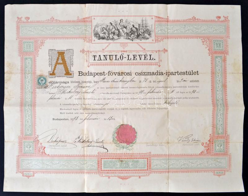 Leírás: 1875 Tanuló-Levél Budapest-fővárosi csizmadia -ipartestület, okmánybélyeggel (1 korona), hajtogatva, 46x59cm