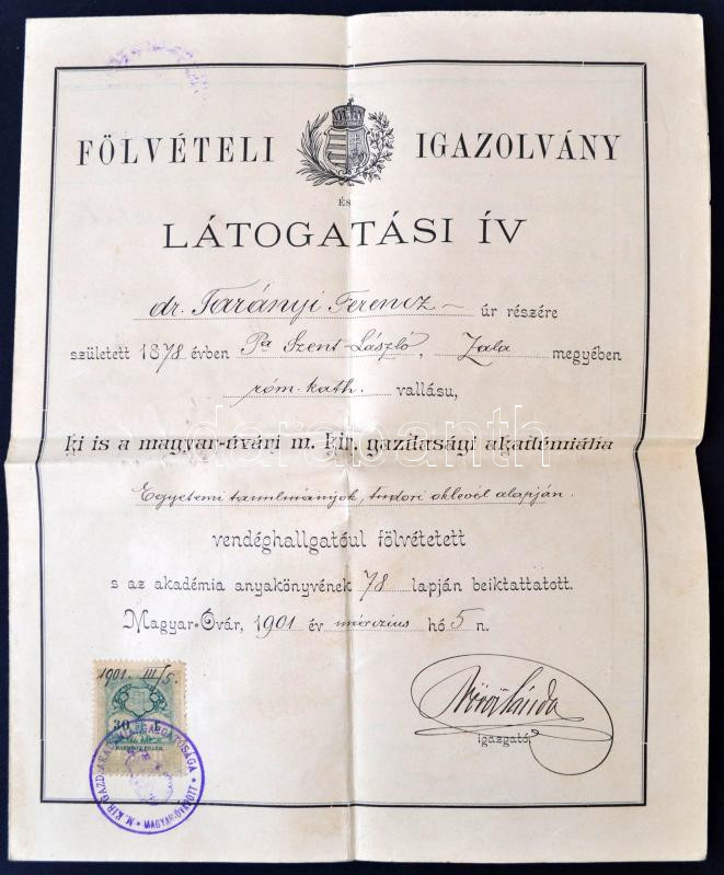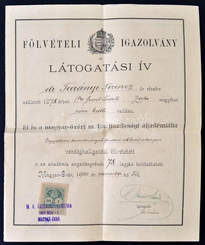 1878 Mosonmagyaróvári gazdasági akadémia látogatási bizonyítványai Tar... https://www.darabanth.com/hu/262-Gyorsarveres/262.0/Festmeny-mutargy-papirregiseg-egyeb/Okmanyok~36/1878-Mosonmagyarovari-gazdasagi-akademia-latogatasi-bizonyitvanyai-Taranyi-Ferenc-nagybirto~II1299437