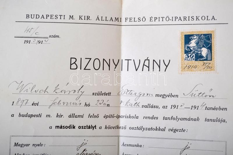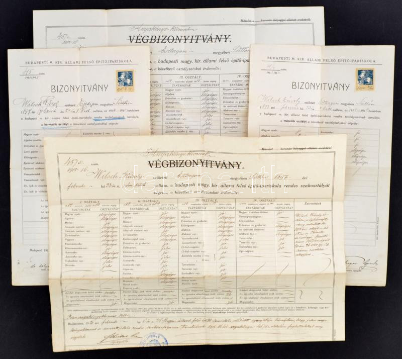 1914-20 VégbizonyÃtványok a budapesti m. kir. áll. felsÅ‘ épÃtÅ‘-ipariskola elvégzett osztályairól, illetve anyakönyvi kivonatok az iskola elvégzésérÅ‘l és a szerzett érdemjegyekrÅ‘l; összesen 4 db.