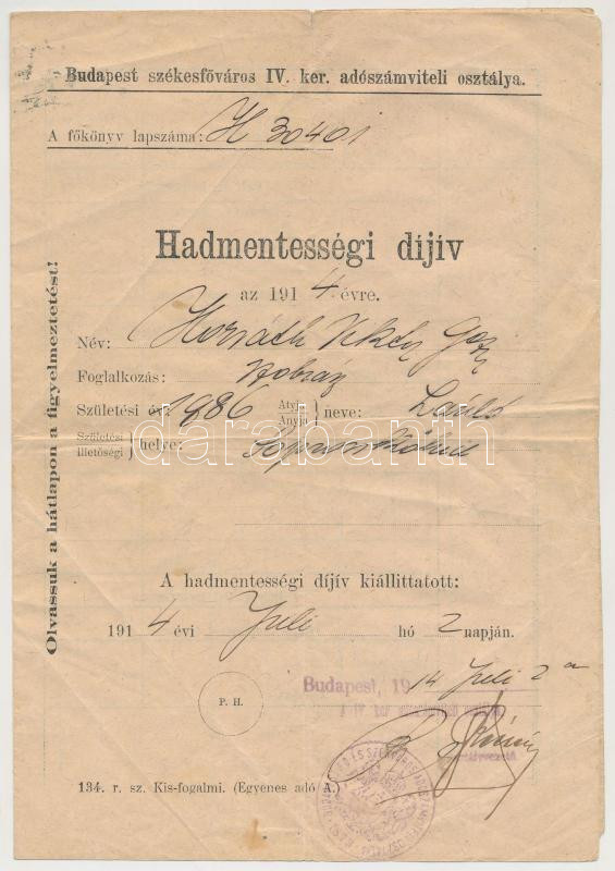 1914 Hadmentességi díjív szobrász részére kiállítva https://www.darabanth.com/hu/262-Gyorsarveres/262.0/Festmeny-mutargy-papirregiseg-egyeb/Okmanyok~36/1914-Hadmentessegi-dijiv-szobrasz-reszere-kiallitva~II1303592