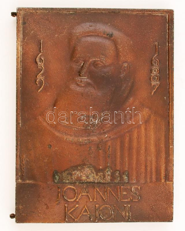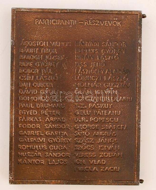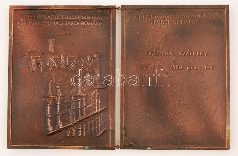 1980 Szárhegy/Lăzarea, Román-magyar, magyar-román fordÃtói napok/Ziele traducerilor româno-maghiare ÅŸi maghiaro-române, diptichon formátumú bronz emlékplakett, elülsÅ‘ oldalán Kájoni János portréjával, hátoldalán a résztvevÅ‘k névsorával, jelzés nélkül, összecsukva: 19×14 cm, kihajtva: 19×29 cm