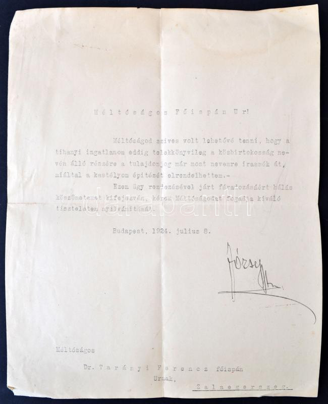 1924 József főherceg saját kézzel aláírt levele, melyben köszönetét fejezi ki a zalai főispánnak tihanyi birtoka ügyének rendezésében történt közbenjárásáért