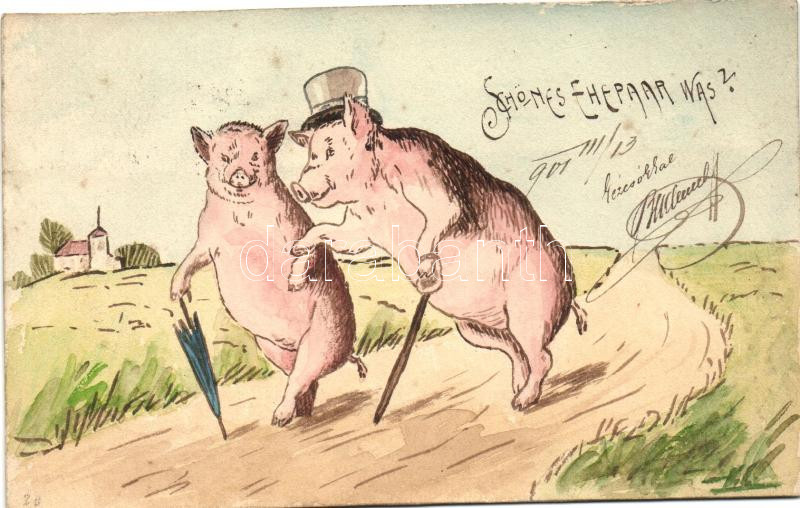 'Schönes Ehepaar' pigs, hand-painted postcard (see backside ... https://www.darabanth.com/hu/262-Gyorsarveres/262.0/Kepeslapok/Allat~100065/Schones-Ehepaar-pigs-hand-painted-postcard-see-backside-decoration-too~II1303249
