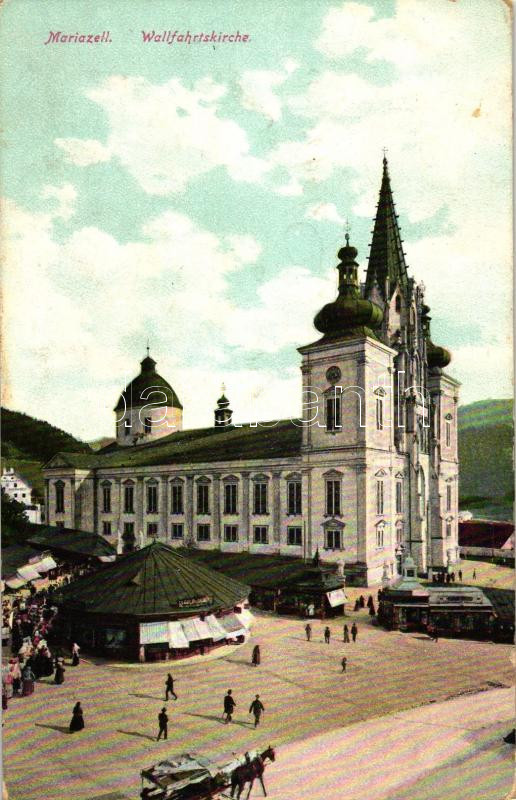 Leírás: Mariazell, Wallfahrtskirche / church, market buildings, 'Gold & Silber' shop (EK)