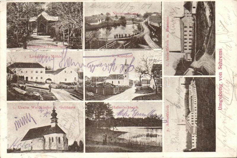 Schrems, Vereinsberg-Promenade, Langthaler-Mühle, Niederschrems, Kleedorf, Waldkirche, Haferdeckteich, Anderlfabrik, Anderlfabrik m. Braunau / promenade, mill, church, lake, factory (fa)