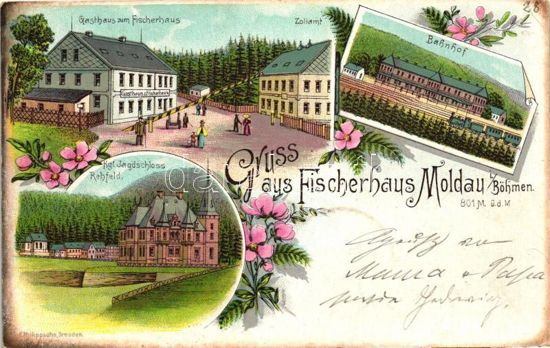 Leírás: 1899 Moldava, Moldau i. Böhmen; Gasthaus zum Fischerhaus, Zollamt, Bahnhof, Jagdschloss, Rehfeld / guest house, railway station, hunting castle, customs office, floral, litho (EK)