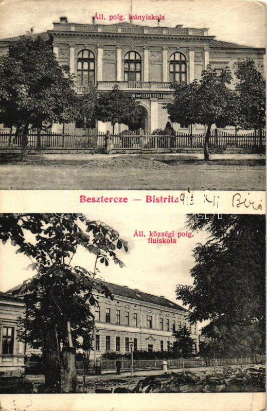 Leírás: Beszterce, Bistrita; Állami polgári leányiskola és állami községi polgári fiúiskola / boy and girl schools (kis szakadás / small tear)