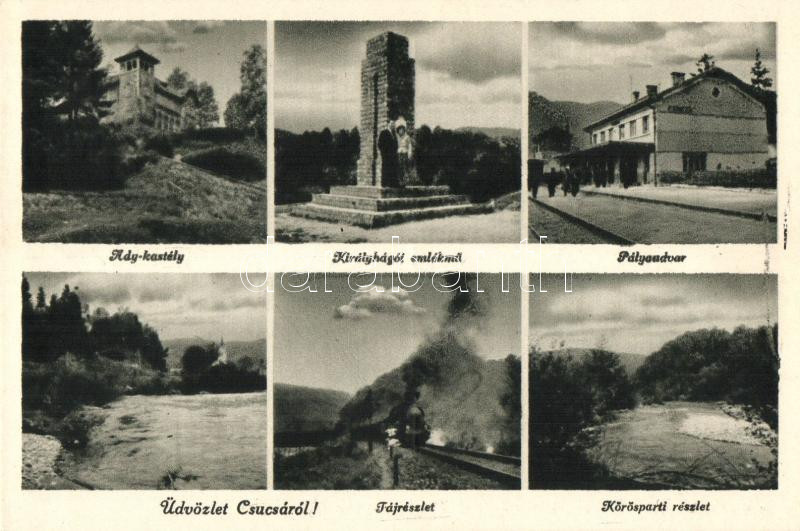 Leírás: Csucsa, Ciucea; vasútállomás, gőzmozdony, Ady-kastély, Királyhágó emlékmű, Kőrősparti-részlet