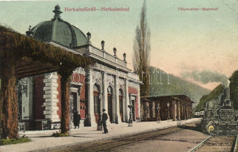 Leírás: Herkulesfürdő, Baile Herculane; vasútállomás, pályaudvar, mozdony / railway station, locomotive (EB)