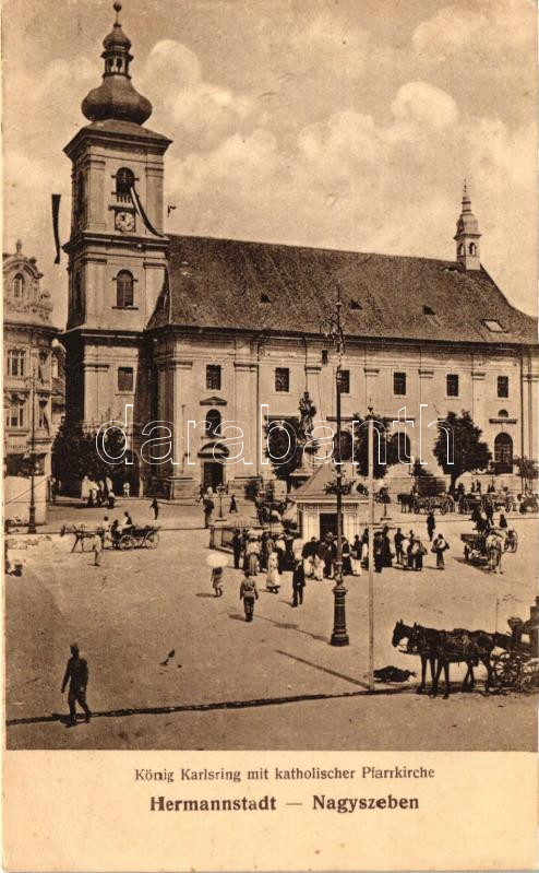 Nagyszeben, König Karlsring mit Katolischer Pfarrkirche / square, Cath... https://www.darabanth.com/hu/262-Gyorsarveres/262.0/Kepeslapok/Erdely~100025/Nagyszeben-Konig-Karlsring-mit-Katolischer-Pfarrkirche-square-Catholic-church-market~II1020442