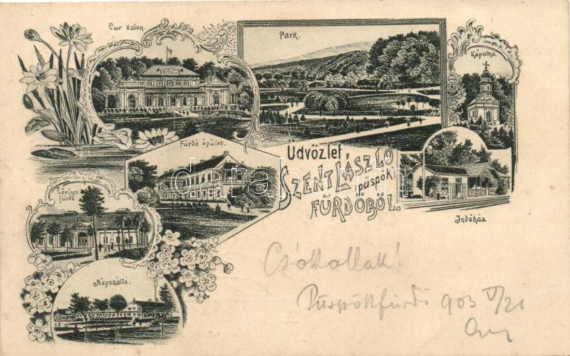 Leírás: Püspökfürdő, Szentlászló-fürdő, Vasútállomás, Népszálló, / multi-view with railway station, floral Art Nouveau
