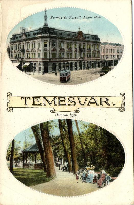 Temesvár, Timisoara; Bonnáz és Kossuth Lajos utca, villamos, Coronini ... https://www.darabanth.com/hu/262-Gyorsarveres/262.0/Kepeslapok/Erdely~100025/Temesvar-Timisoara-Bonnaz-es-Kossuth-Lajos-utca-villamos-Coronini-liget-streets-tram-park~II1303650
