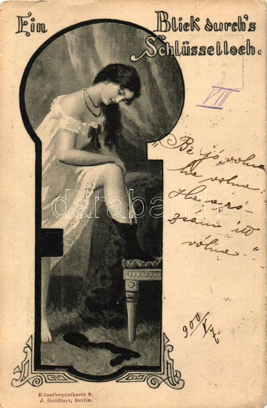 'Ein Blick durch's Schlüsselloch' Künstlerpostkarte 8. ... https://www.darabanth.com/hu/262-Gyorsarveres/262.0/Kepeslapok/Erotika~100072/Ein-Blick-durchs-Schlusselloch-Kunstlerpostkarte-8-J-Goldiner-erotic-postcard-EK~II1302006