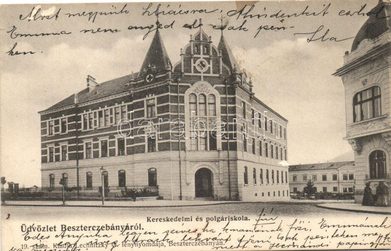 Leírás: Besztercebánya, Banska Bystrica; Kereskedelmi és polgáriskola, kiadja Lechnitzky fénynyomdája 19. / school (EK)